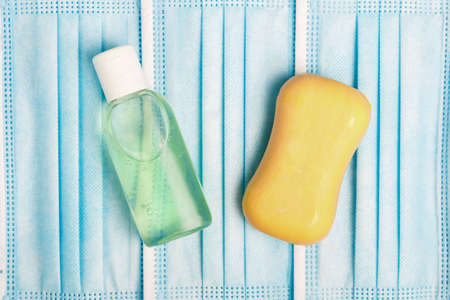 antiseptic gel and soap on a background of blue medical surgical masks. concept of protection against virus during a pandemic and quarantine. top view, flat lay.