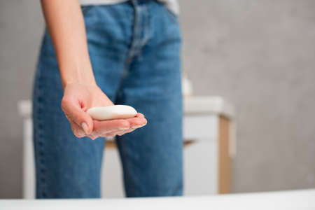 Close up details of woman washing hands at home . Hygiene and body cleaning concept detail