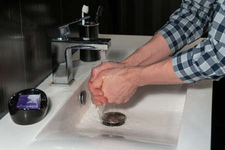 Washing hands under the faucet with water. Washing hands with soap and water. Hand hygiene concept