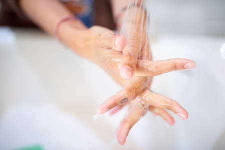 Close view of washing hands with soap for prevention of germs, viruses and bacteria.