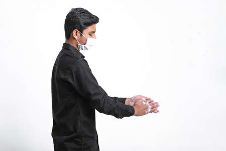 Woman washes her hands with soap on a white background. Hygiene concept.