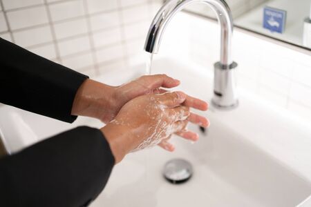 Coronavirus pandemic prevention. Washing hands with soap and warm water. Rubbing nails and fingers. Woman washing hand under running water.