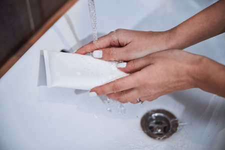 Two hands holding a white tube with face cream under a stream of water from a tap