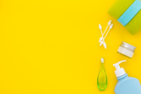 Children's personal care kit. Bath accessories with teeth brush on yellow background top view.