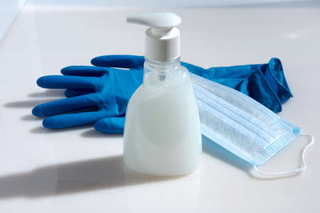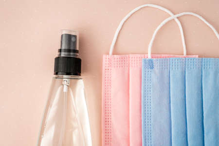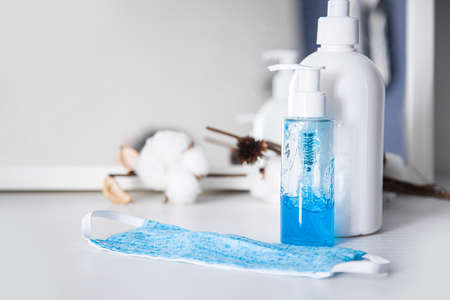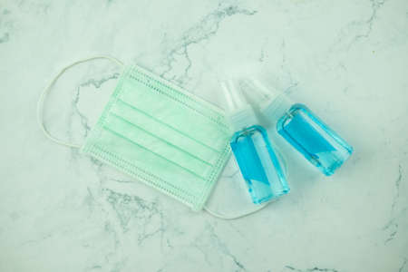 alcohol gel. Coronavirus prevention medical surgical masks and hand sanitizer gel for hygiene corona virus protection.