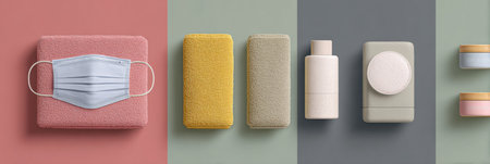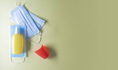 biosafety items for personal use and hand disinfection on unicolor background