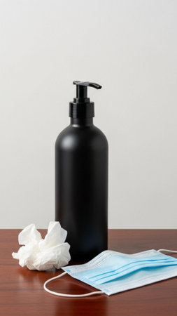 bottle of lotion, sanitizer or liquid soap and protective mask over light grey background