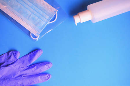 protective medical mask, sanitizer gel and gloves. protective measures against virus, bacteria