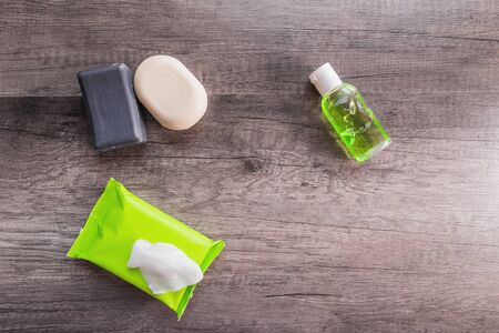 Personal protective equipment against viruses, personal hygiene concept, antiseptic gel, disinfectant wipes and soap. Protection against infections and coronovirus