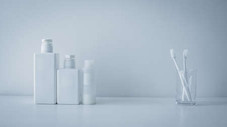 White travel set personal products for shower and body care on blue background.