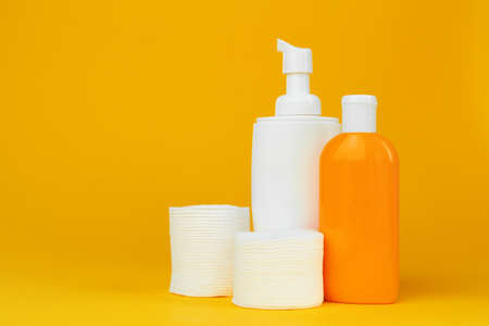 Stack of cotton discs and skicare cosmetic bottle