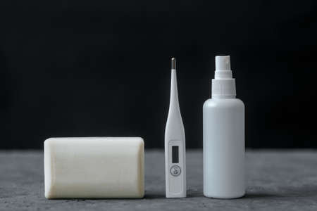 Alcohol hand gel sanitizer, face mask and thermometer, Self protection from Covid-19 flu virus outbreak pandemic, Coronavirus germ spreading by coughing and sneezing droplet.