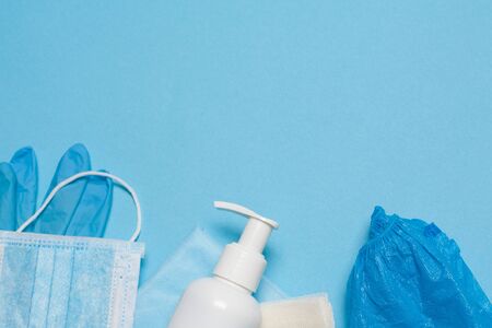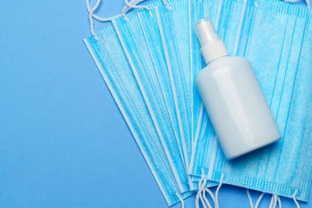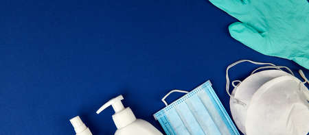 Flat lay of protection, medical protective masks, gloves, hand sanitizer bottles, antiseptic, disinfection, spray on blue background, copy space.