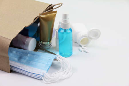 Alcohol in spray bottle with medical masks and covid-19 protective gear in brown paper bag on white background.
