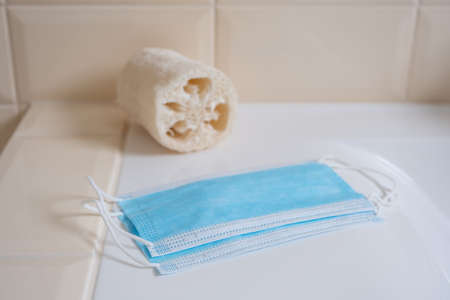 Antiviral medical masks. Surgical protective mask. Medical respiratory bandage for the face. Quarantine, stay at home. COVID-19 coronavirus pandemic