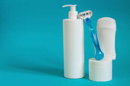 Various cosmetic products with deodorant. Beauty care accessories, shaving set with razor and shaving cream on blue background.
