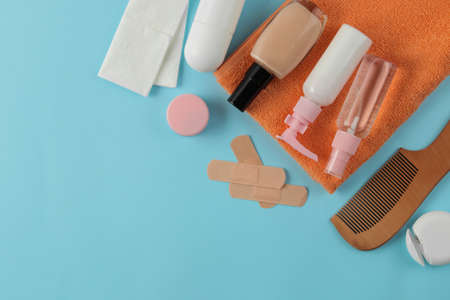 A set of cosmetics and personal care products for traveling on a gentle light blue background. top view. travel cosmetics