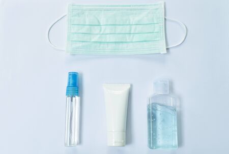Medical equipment set that consist of face mask, alcohol gel and cleansing gel that help to protect mask cover the mouth and nose from virus, bacteria, dust or other pollution. the mask is taken on mask on isolated light blue background.