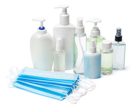 group of hand sanitizer spray and liquid soap bottles and protective masks isolated on white background