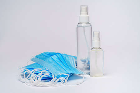 Antivirus set of items: various filtering safety face masks, sanitizer for hands on light background. Stop virus concept.