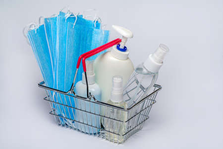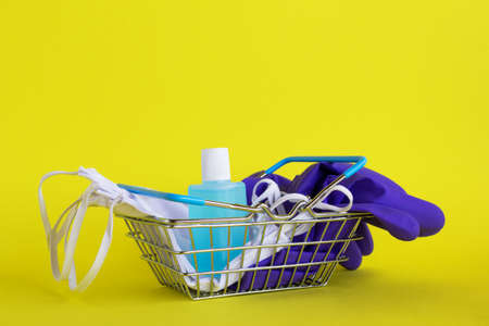 Face masks, pair of disposable medical gloves and bottle of hand sanitizer gel in small shopping basket on yellow background with copy space. Concept shopping in supermarket in new normal lifestyle.