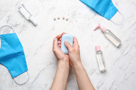 Hands with soap, sanitizers and medical masks on light background