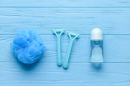 Safety razors, sponge and bottle of deodorant on blue wooden background
