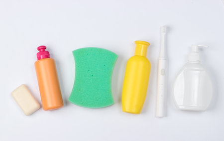 Set of oral hygiene and bath accessories on light background