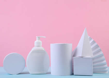 Art colorful geometry blue style and skin care cosmetics. Origami in a blue color and cosmetics in white and blue colors: serum, face cream, face tonic. Paper mock up and luxury cosmetic.