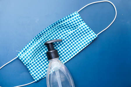 Disinfectant gel and masks, on a blue background