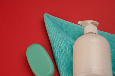 soap bath supplies hygiene body care red background