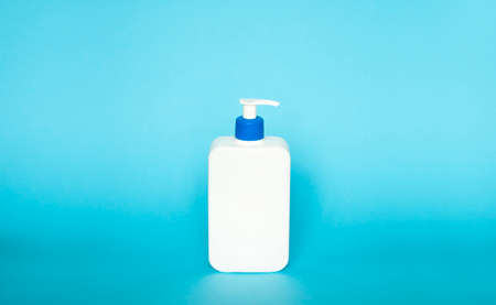 Liquid container for gel, lotion, cream, shampoo, bath foam. Cosmetic plastic bottle with blue dispenser pump on blue background. Cosmetic packaging mockup with copy space.