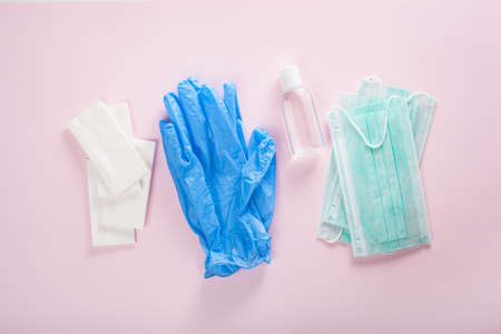 protective medical mask, sanitizer gel and gloves. protective measures against virus, bacteria