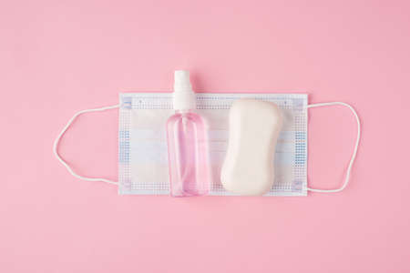 Top above overhead close up view flat lay photo of mask soap and sanitizer isolated on pastel pink color background with copyspace