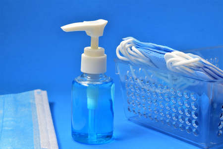 Disinfectant gel and masks, on a blue background