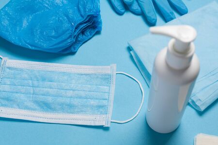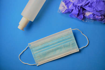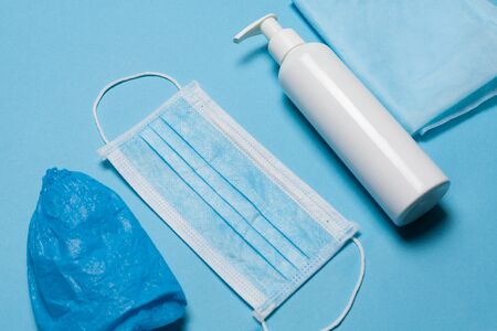 protective medical mask, sanitizer gel and gloves. protective measures against virus, bacteria