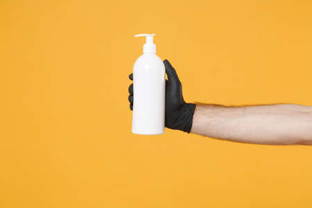 Close up cropped photo of male hold in hand bottle with antibacterial sanitizer soap isolated on yellow background. Epidemic pandemic coronavirus 2019-ncov sars covid-19 flu virus. Mock up copy space.
