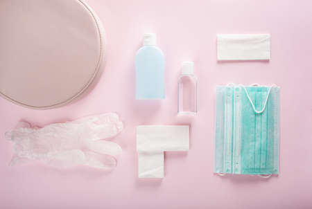 protective medical mask, sanitizer gel and gloves in pink bag. protective measures against virus, bacteria