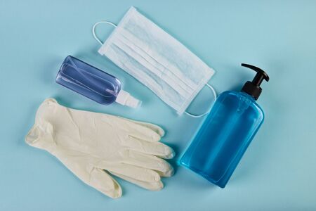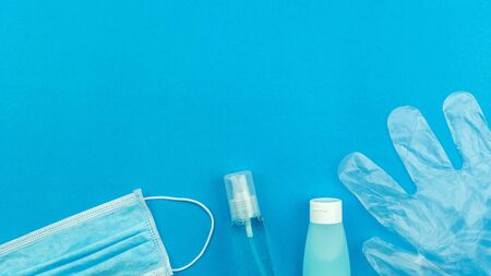 Medical gloves mask and alcohal gel for protecting infection during virus pandemic top view on light blue banner background