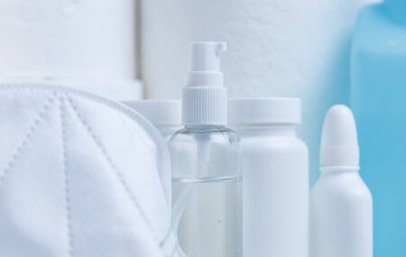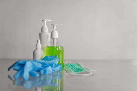 Antiseptic and masks on a light background. Hygiene in case of a virus.