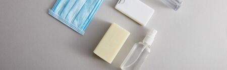 top view of hand sanitizer in spray bottles, medical mask and antibacterial soap on grey background, panoramic shot