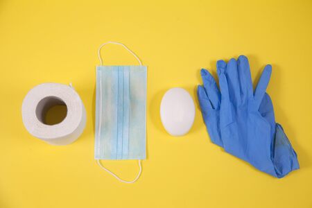 Toilet paper, soap, medical mask, blue rubber gloves shot from above close-up on a yellow background. Sanitation. Medicine. Medical education