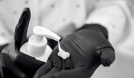 Hand sanitizer in gloved hand closeup. Call for hand disinfection. Stop coronavirus concept banner. Using antibacterial gel for hands during quarantine