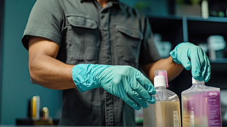 A man wearing nitrile gloves handling cleaning supplies, illustrating safe and sanitary cleaning practices.