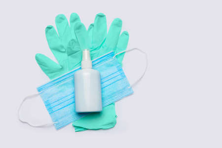 Horizontal shot of concept of medicine health care. Prevention of coronavirus. A set of sanitizer, medical mask and rubber gloves on a gray background.