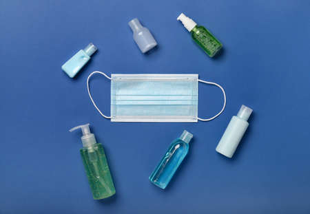 Medical mask and hand sanitizers on color background