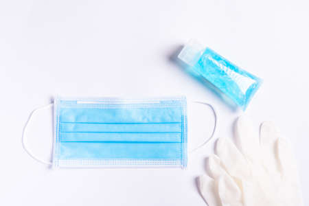 Latex gloves, Face medical mask and hand sanitizer on white background. Coronavirus COVID-19 protection. Horizontal view. White background