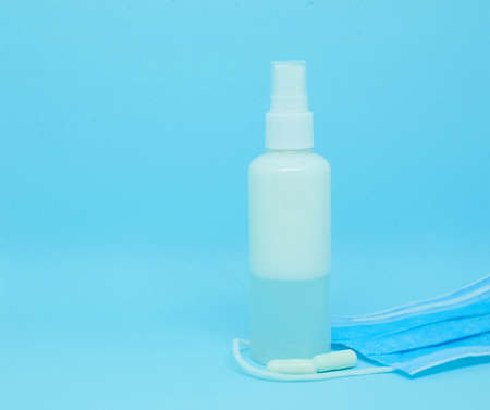 Antiseptic spray and MEDICAL MASK on a BLUE background, model of the COVID-19 coronavirus, means of protection against disease.