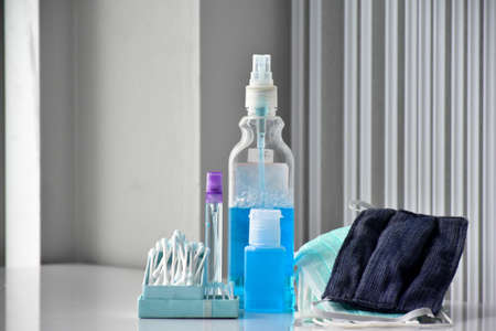 New normal, protective equipments; face mask, face shield, hand sanitizer, hand soap, alcohol spray, contton buds. Concept for protecting coronavirus