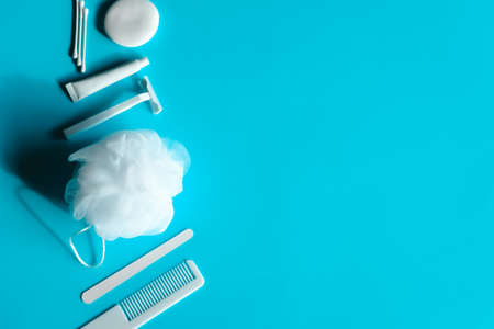 White travel set personal products for shower and body care on blue background.